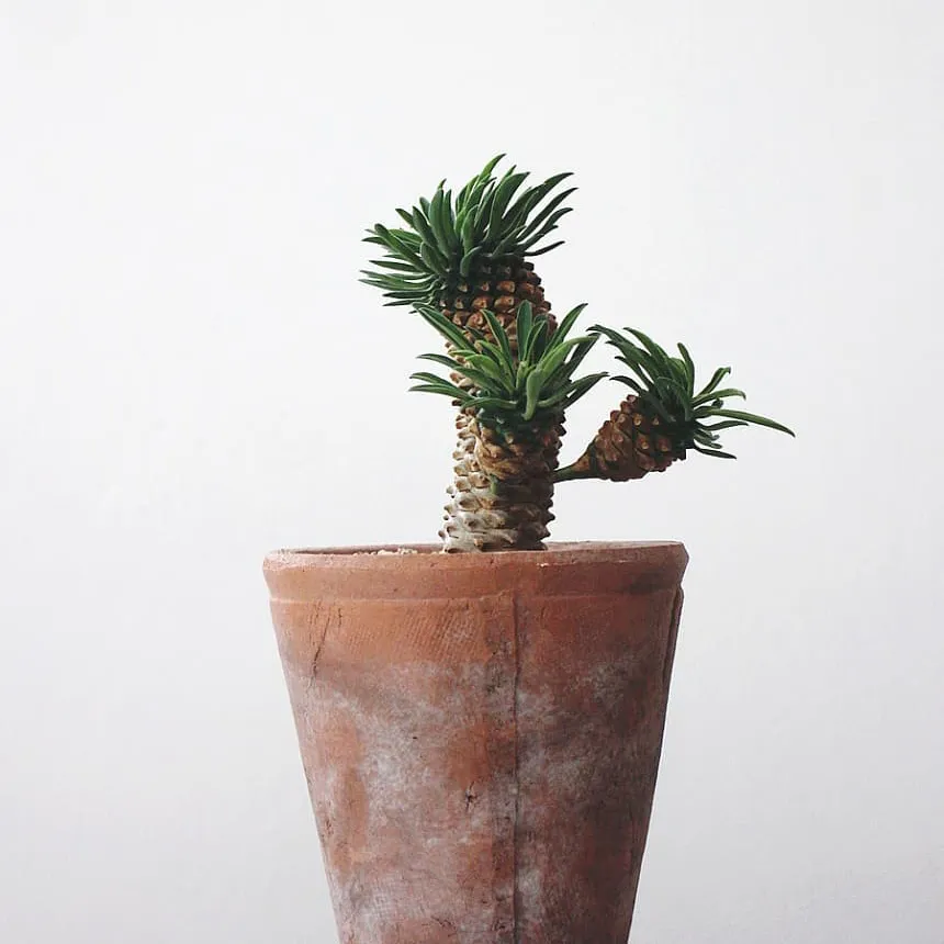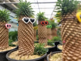괴마옥의 가장 큰 특징은 마치 파인애플 껍질 같은 굴곡이 있는 줄기예요. 이 굴곡은 실제로 잎이 떨어져 나간 흔적인 엽흔인데, 시간이 지나면서 새로 자라는 줄기는 녹색이지만 점점 갈색으로 목질화되면서 더욱 파인애플 같은 모습을 갖게 되죠.