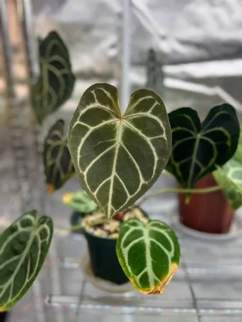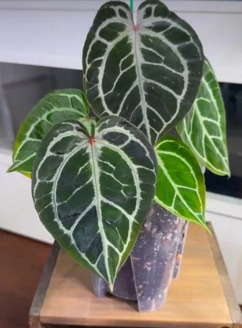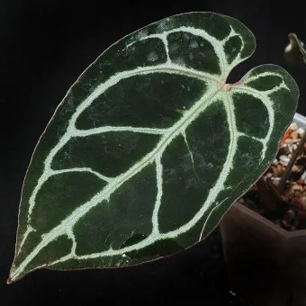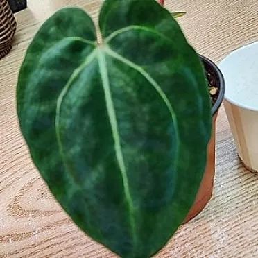 안스리움 크리스탈리눔(A. crystallinum): 꽃보다는 잎이 아름다운 품종이에요. 벨벳같은 질감의 큰 잎에 하얀 잎맥이 선명해서 관엽식물로 인기가 많아요.