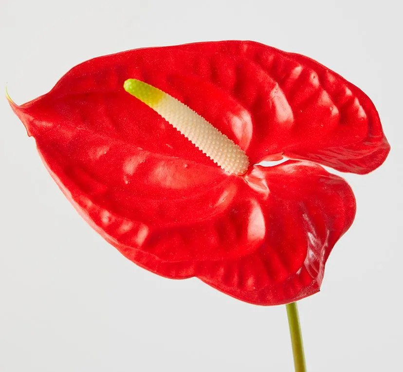 안스리움 샤르체리아눔(A. scherzerianum): 꽃대가 나선형으로 말려있는 게 독특해요. 일반 품종보다 조금 더 서늘한 환경을 좋아해요.